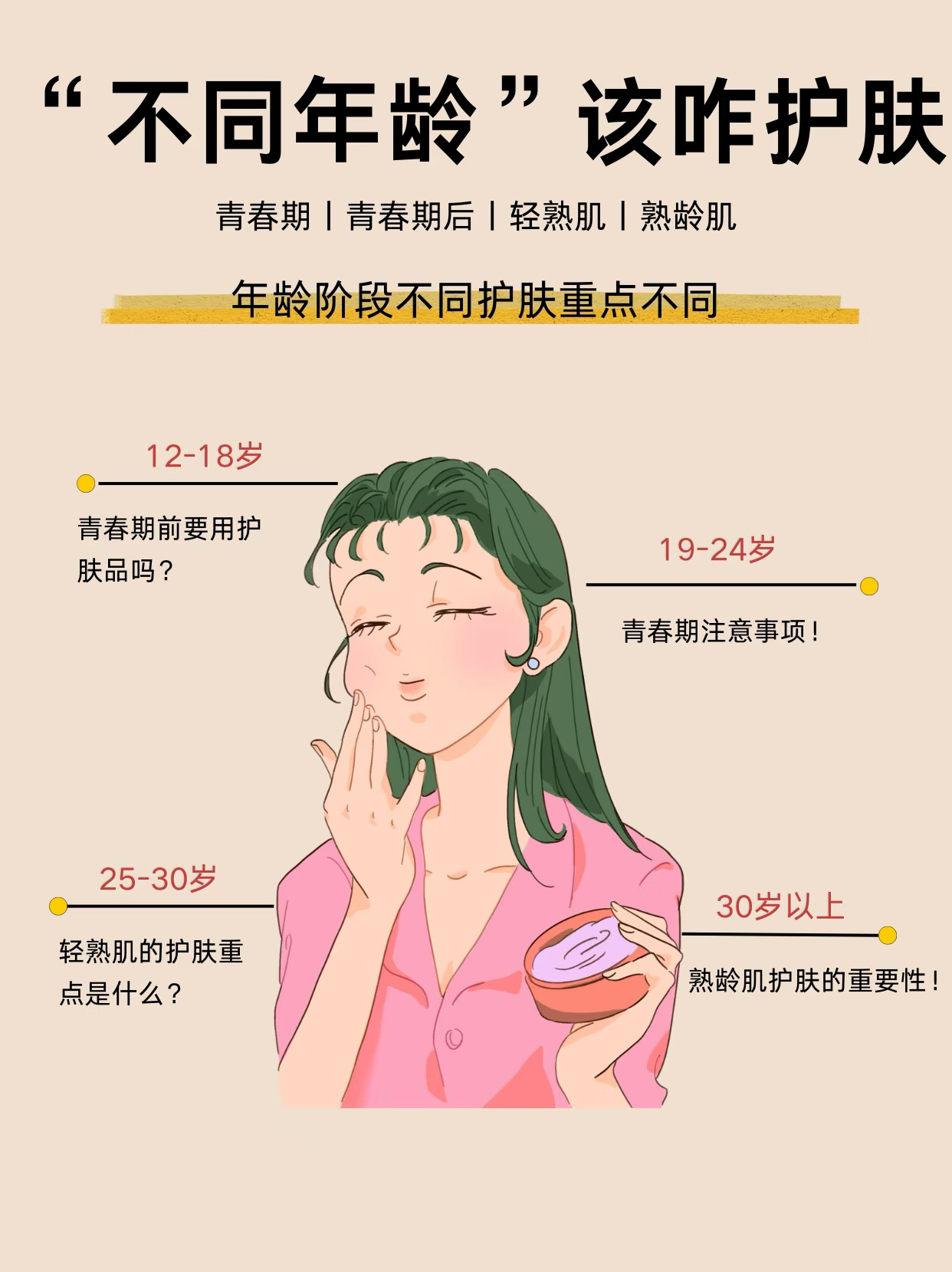 针对不同年龄段的皮肤状态,选择适合的洗面奶、水乳、面霜是非常重要的。以下是针对不同年龄段的护肤重点以及相应的产品选择建议