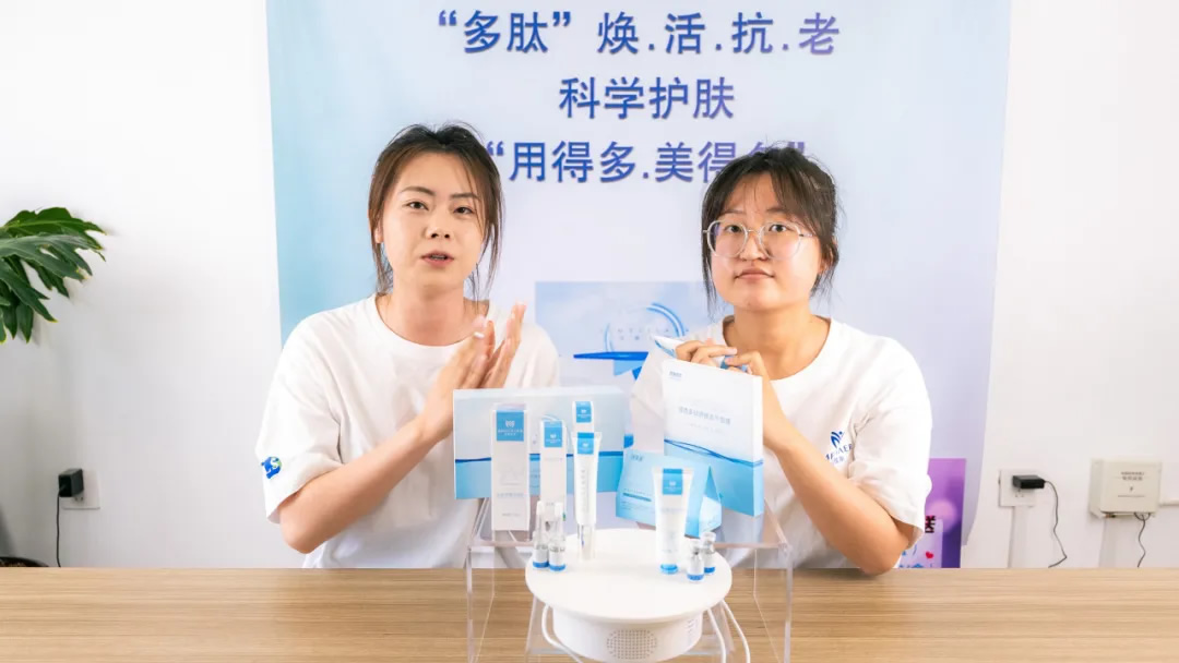 6月14日,在公司直播间,一场由员工带来的美妆直播正在上演。两名年轻主播将公司研发的多肽冻干粉、多肽冻干面膜、多肽净澈洁面乳、多肽柔润护手霜以及多肽抗皱紧致眼霜等产品进行逐一展示,并详细介绍多肽产品的成分、功效及使用方法。专业的讲解、有趣的互动让直播间热度爆棚。